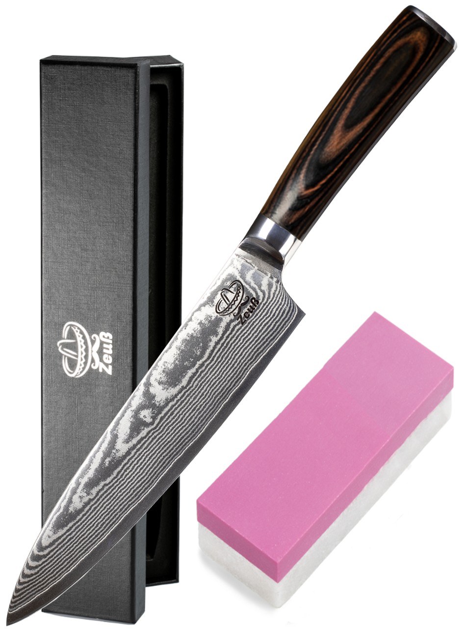 Jedes Messer ist ein Unikat – durch die einzigartige Maserung des Damaststahls und die handgefertigte Verarbeitung. Es wird inklusive Schleifstein, Klingenschutz und in einer hochwertigen Geschenkbox geliefert.
